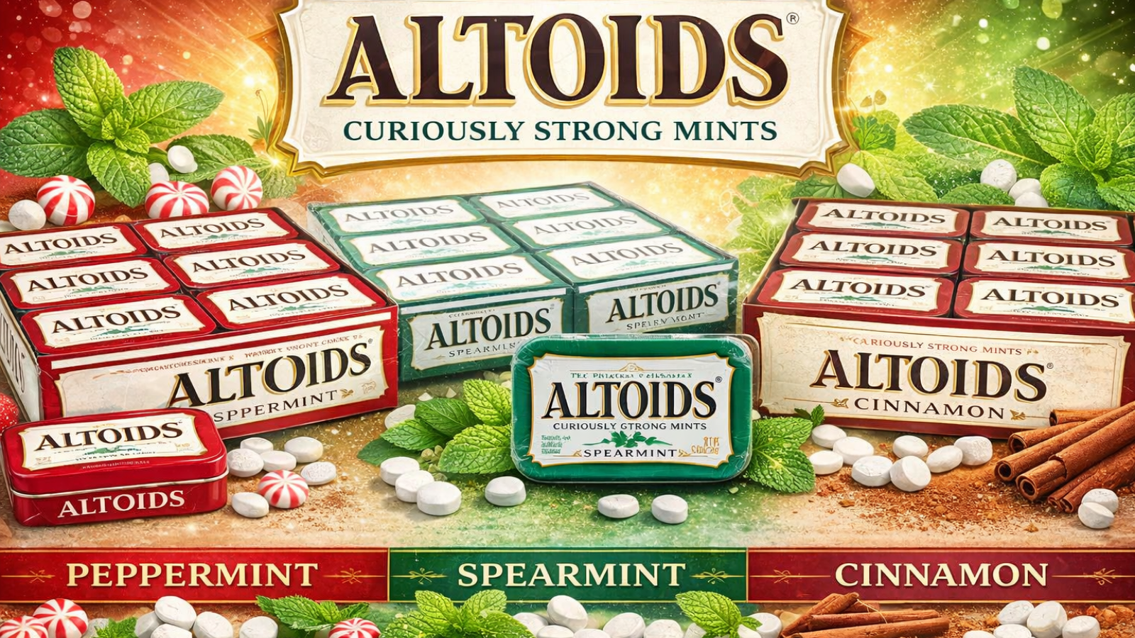 $18.91Altoids Peppermint Breath Mints, 1.76 oz Tin (6 Pack) Altoids Peppermint Breath Mints deliver an intense peppermint flavor designed to freshen breath quickly, packaged in the iconic curiously strong...